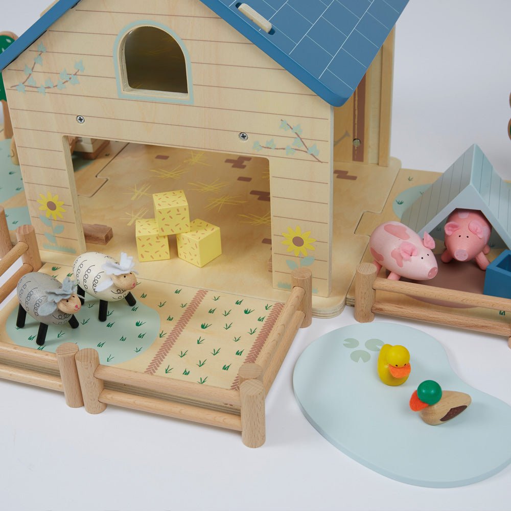 Teach little ones about growing and harvesting crops with ourWooden Tractor & Farmers Set: the set includes a tractor and trailer to push around, plus poseable farmer figures to play with too, or pair with our Play & Store Wooden Toy Farm Set.